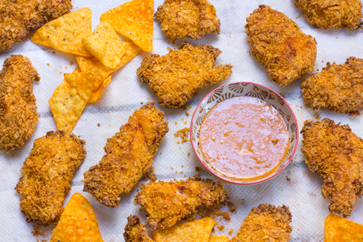 - Rebozar el pollo en harina, huevo y Doritos.