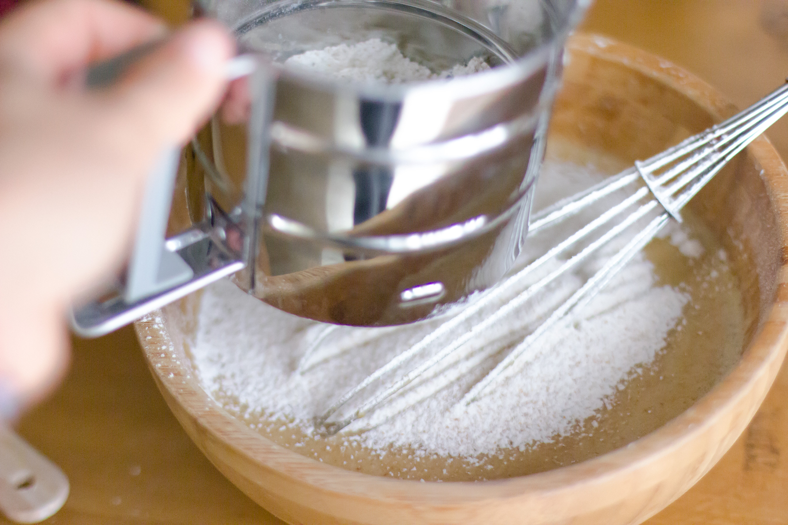 3. En esta mezcla bien unificada, añadimos la harina, el salvado, la levadura y la sal tamizado, y volvemos a mezclar toda la masa hasta que quede bien unificada.2