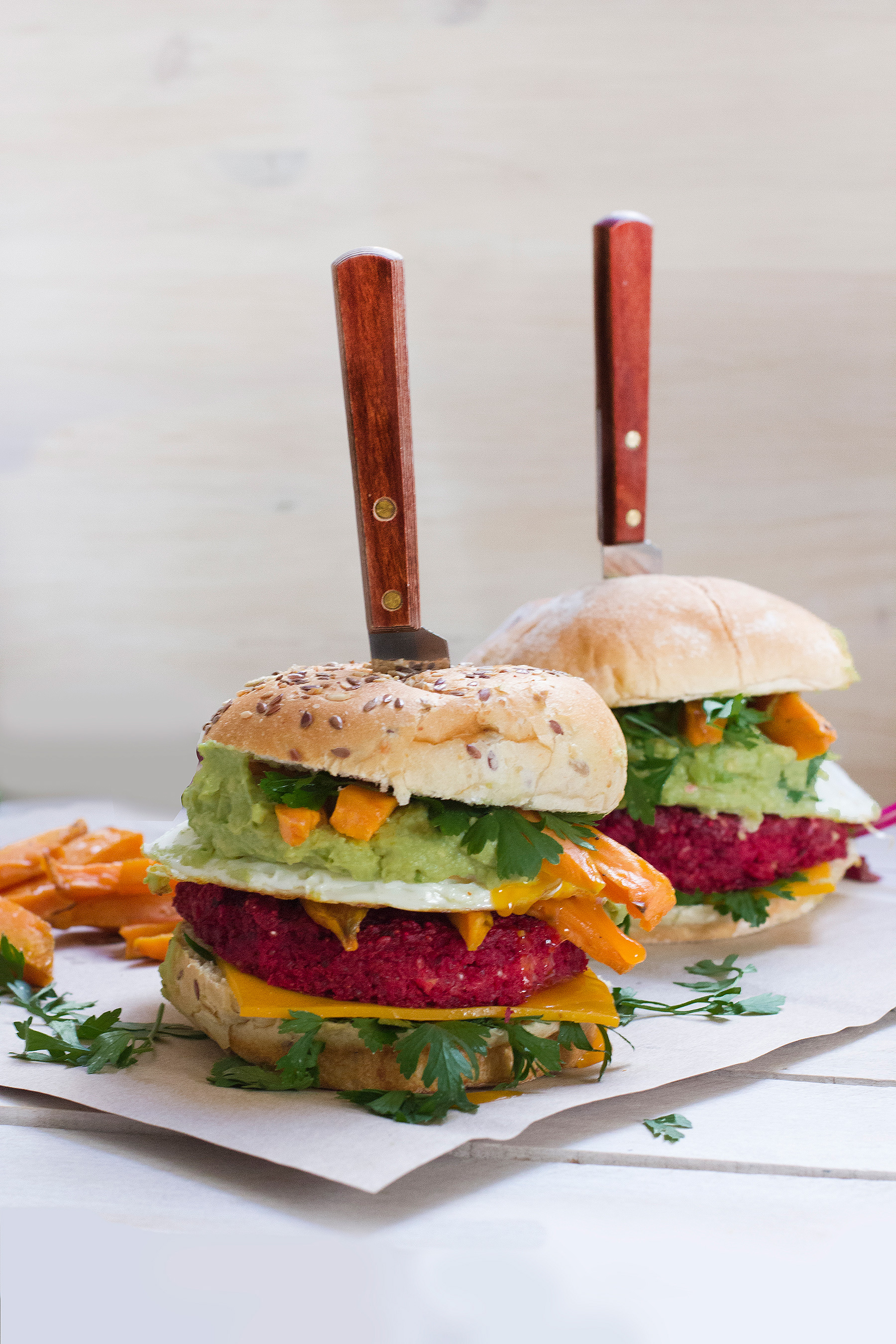 - Ya sólo nos queda montarlas en este orden: hamburguesa, hummus de aguacate, el huevo, los bastones de batata, un poco de perejil picado y ¡a disfrutarla!