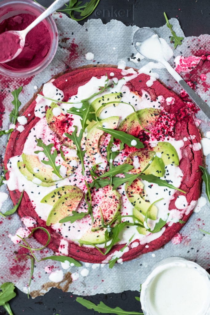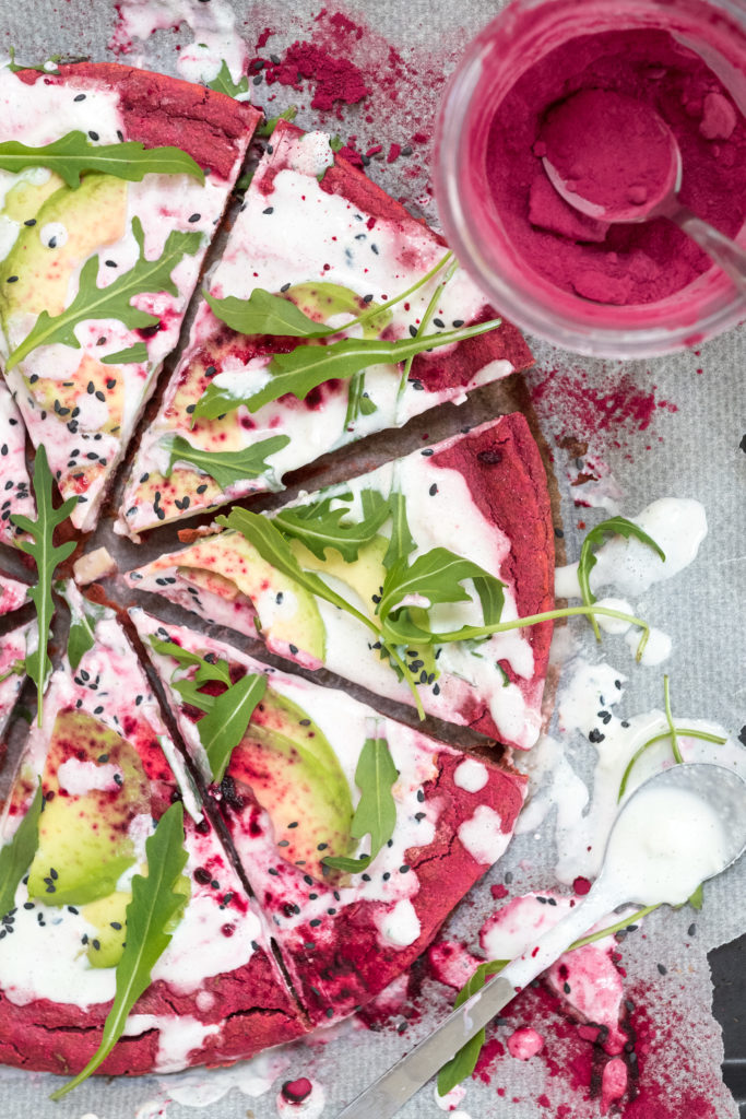 Es sin duda la mejor pizza de quinoa que he hecho jamás. Desde que descubrí el polvo de remolacha, solo pienso en ponerlo todo rosa, y pensé que una pizza rosa debería ser ? y si además, la hacía saludable iba a sería doble ??. Quería que el color destacara, se viera aún más bonita y bien rosa, por lo que la he rellenado con ingredientes ricos y sanos, pero que le dieran mucha vida y contraste al rosa.