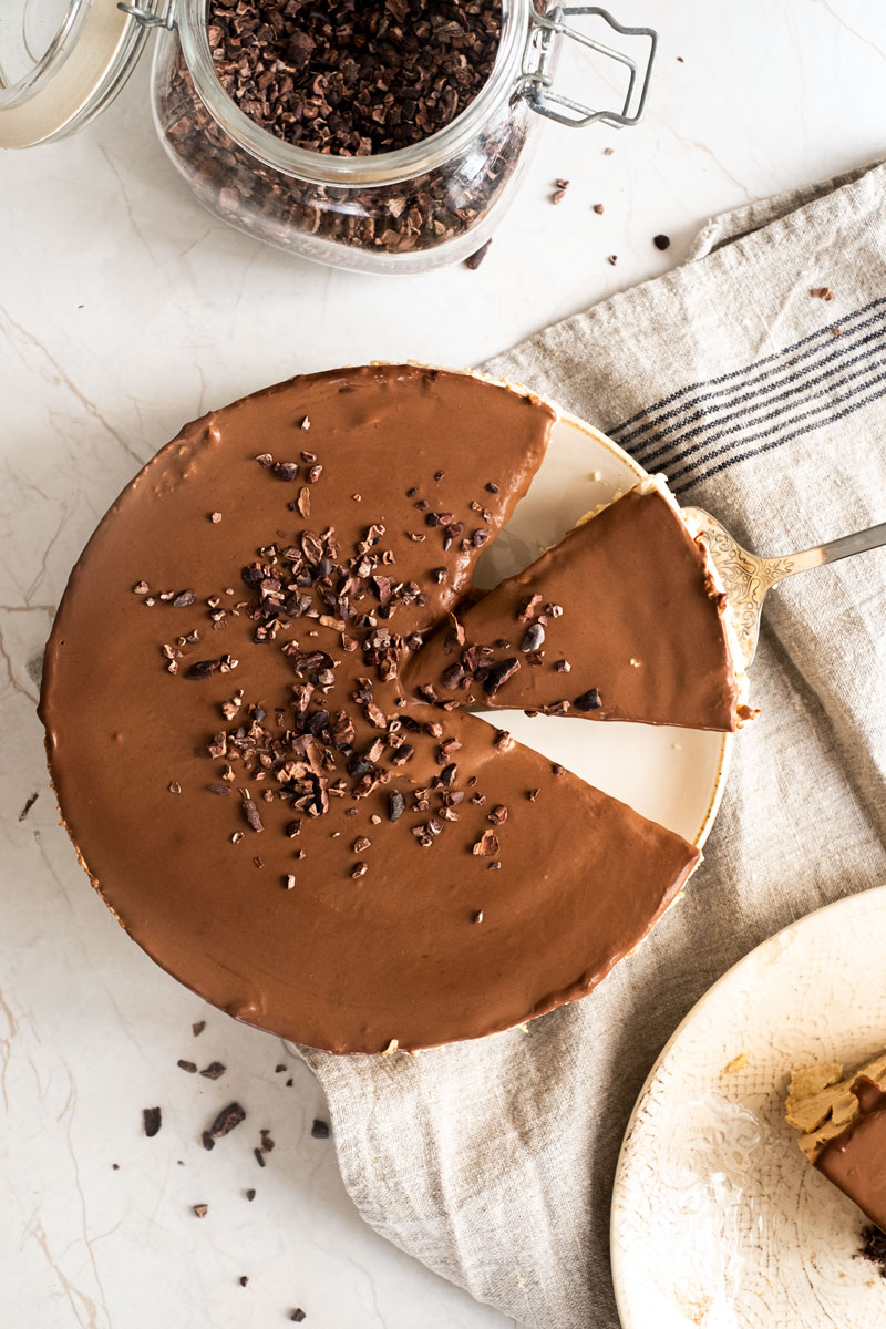 No lleva gluten y la base está hecha con ingredientes saludables, evitando el uso de galletas ultra procesadas. La parte de la cheesecake está hecha con mascarpone. El resultado con este tipo de queso junto con la nata, que debe ir siempre montada, es especialmente cremoso. Y la última capa, compuesta por chocolate, el contraste perfecto de sabores para una cheesecake de café al más puro estilo capuchino.